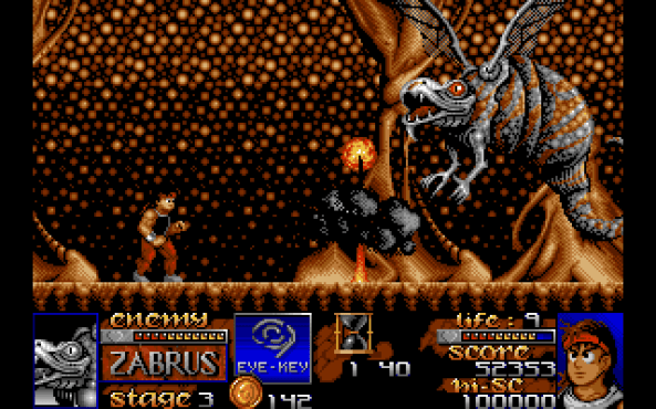 El juego consta de doce niveles, cuatro de ellos correspondientes a los jefes finales, mientras que el resto te llevan a diferentes lugares de camino a la fortaleza del Mal. La aparición de enemigos en pantalla es abundante por ambos lados, de hecho aquí no vale limpiar la zona y descansar ya que tienes un límite de tiempo para acabar el nivel; y porque los bichos siguen apareciendo sin cesar desde ambas esquinas de la pantalla. Cada enemigo aniquilado suelta una moneda que más tarde puedes usar para rellenar tu energía, o comprar nuevas armas como hachas, boomerangs o bolas de fuego. En el transcurso de la batalla encontrarás cofres con suculentos ítems en forma de vidas extras, manzanas que aumentan tu energía, relojes de arena que dan un respiro al tiempo, e incluso algún que otro objeto “maligno” capaz de voltear la imagen de la pantalla. A todos estos contratiempos hay que sumar el hecho de salvar de dos a tres monjes por nivel, mediante unas llaves en forma de ojo que se encuentran estratégicamente situadas en los niveles. Pero cuidado, también hay monjes trampa que tras haberlos liberado inocentemente te restarán un buen puñado de energía. La dificultad es bastante elevada ya que no vas a encontrar checkpoints de ningún tipo, hay que acabarse el juego a capón, y si bien los tres primeros niveles son asequibles, a partir del cuarto la acción se complica, los enemigos se hacen mucho más fuertes y no puedes tomarte ni un segundo de respiro. En definitiva, adrenalina en estado puro.