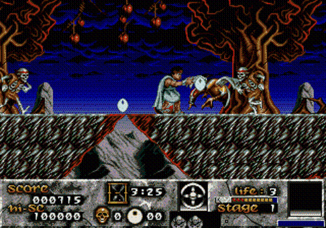 El juego consta de doce niveles, cuatro de ellos correspondientes a los jefes finales, mientras que el resto te llevan a diferentes lugares de camino a la fortaleza del Mal. La aparición de enemigos en pantalla es abundante por ambos lados, de hecho aquí no vale limpiar la zona y descansar ya que tienes un límite de tiempo para acabar el nivel; y porque los bichos siguen apareciendo sin cesar desde ambas esquinas de la pantalla. Cada enemigo aniquilado suelta una moneda que más tarde puedes usar para rellenar tu energía, o comprar nuevas armas como hachas, boomerangs o bolas de fuego. En el transcurso de la batalla encontrarás cofres con suculentos ítems en forma de vidas extras, manzanas que aumentan tu energía, relojes de arena que dan un respiro al tiempo, e incluso algún que otro objeto “maligno” capaz de voltear la imagen de la pantalla. A todos estos contratiempos hay que sumar el hecho de salvar de dos a tres monjes por nivel, mediante unas llaves en forma de ojo que se encuentran estratégicamente situadas en los niveles. Pero cuidado, también hay monjes trampa que tras haberlos liberado inocentemente te restarán un buen puñado de energía. La dificultad es bastante elevada ya que no vas a encontrar checkpoints de ningún tipo, hay que acabarse el juego a capón, y si bien los tres primeros niveles son asequibles, a partir del cuarto la acción se complica, los enemigos se hacen mucho más fuertes y no puedes tomarte ni un segundo de respiro. En definitiva, adrenalina en estado puro.