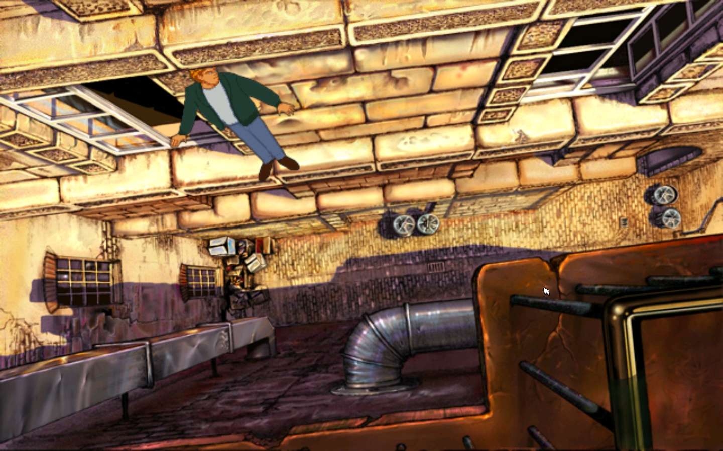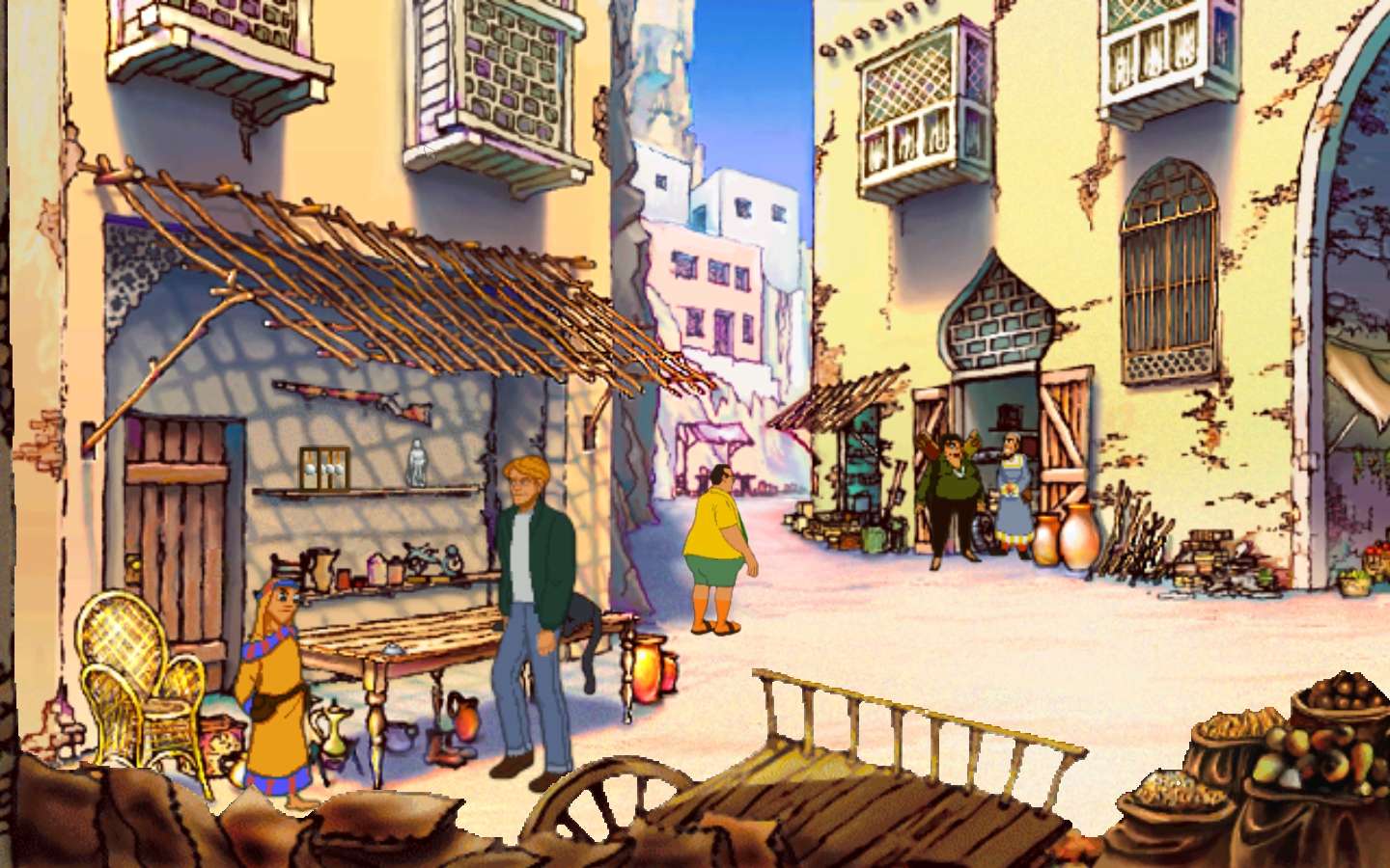Jugablemente Broken Sword no dio opción a sorpresas de ningún tipo. Contamos con el típico interfaz point and clic del género, un inventario donde se almacenan los objetos, y un pequeño diario en el que la historia se va escribiendo poco a poco a medida que resolvemos puzles. La exploración fue, hasta cierto punto, simplificada. Los escenarios cuentan con pocos puntos calientes que son resaltados en cuanto el puntero del ratón pasa cerca de ellos, siendo el propio juego quien nos indica las acciones disponibles para cada objeto, normalmente examinar y manipular. Salvo momentos puntuales, el desarrollo de la trama suele estar encorsetado en pequeños escenarios, no vamos a encontrarnos con grandes puzles globales como se pueden ver en las aventuras de Lucas, por poner un ejemplo. Aquí disponemos de pocas estancias a visitar al mismo tiempo, es decir, los retos a los que nos enfrentamos suelen estar claramente delimitados. Esta simplicidad hace que la dificultad general sea asequible para los más avezados en el género, pero suficiente para que cualquier aficionado a los videojuegos le dé una merecida oportunidad. No os equivoquéis, hay algún que otro acertijo que nos hará sudar la gota gorda, pero en líneas generales Broken Sword es un juego “amigable”, que sabe eludir los temidos bloqueos que todo aficionado al género ha padecido alguna vez.