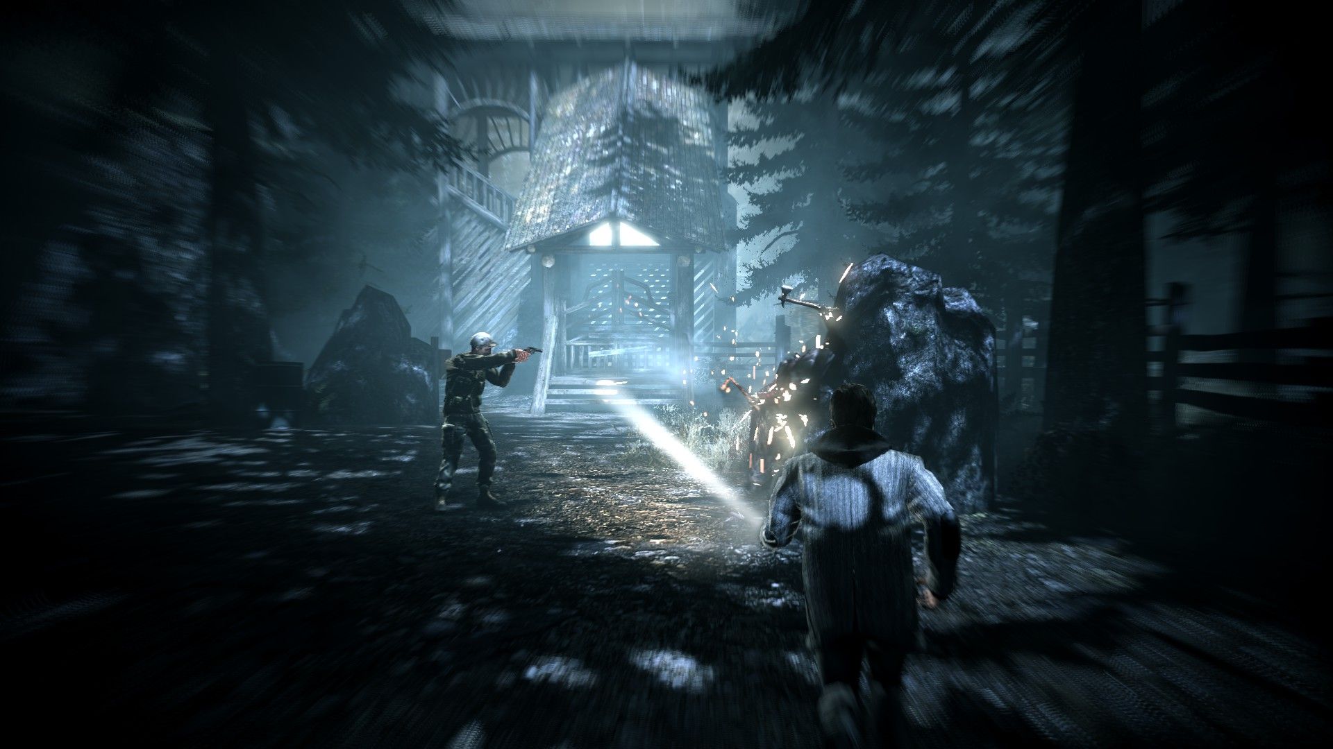 Alan Wake es una aventura de acción en tercera persona ambientada en su gran mayoría en los bosques de Bright Falls. El juego está estructurado en 6 capítulos, a lo largo de los cuales has de enfrentarte a la Oscuridad en todas sus formas, tanto humanos poseídos, como máquinas y objetos que cobran vida a nuestro paso. Para enfrentarse a estas criaturas, Alan cuenta con la luz de su linterna, gracias a la cual podrá despojar a los enemigos de su velo de oscuridad, y acabar con ellos mediante armas de fuego convencionales. El arsenal no es muy variado pero sí efectivo. Además de los típicos revólveres, hay escopetas, fusiles de caza, granadas de luz e incluso bengalas con las que ahuyentar a los enemigos. No se ha implementado un sistema de protección o coberturas como tal, Alan va a pecho descubierto, y solo puede correr durante un tiempo limitado y esquivar los golpes de los poseídos pulsando un botón en el momento justo. Y es un sistema que, en mi opinión, funciona bastante bien.