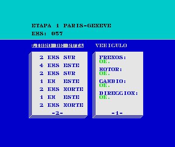 Paris Dakar, desarrollado en 1988 por el tándem Zigurat-Made in Spain, fue una apuesta clara por representar el realismo y la dificultad que entrañaba participar en este rally. No hay que dejarse engañar por la perspectiva cenital desde la que controlamos a nuestro vehículo, ni siquiera por la escasa tasa de frames a la que se mueve el decorado, ya que Paris Dakar nos sorprendía con unas mecánicas jugables muy complejas, y un montón de detalles que para sí quisieran muchos juegos actuales. La carrera estaba dividida en tres escenarios diferentes: las carreteras de Europa, el norte de África con su desierto del Sahara, y por último la franja Niger Senegal cuyo árido recorrido nos llevaba hasta las puertas del Dakar. Cada escenario está dividido en 3 etapas lo que hacía un total de 9 niveles, que pueden parecer pocos, pero creedme que se podían hacer muy, pero que muy largos.