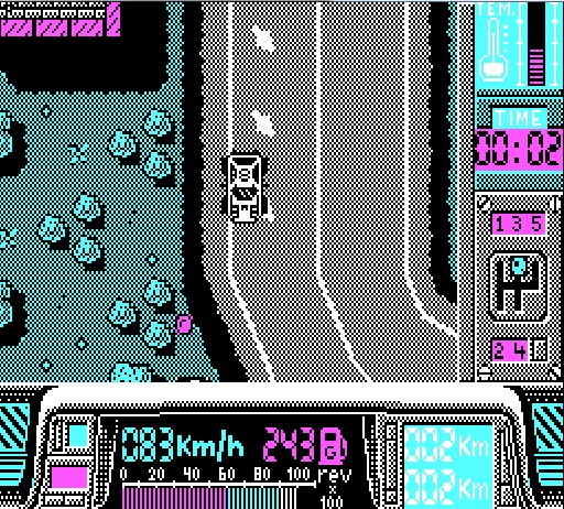 Técnicamente el juego apuesta por un desarrollo en perspectiva cenital, una decisión que considero un acierto total dada las limitadas capacidades de los ordenadores de la época. No obstante los escenarios eran bastante detallistas, las autopistas estaban salpicadas de estaciones de servicio, edificios y carteles, mientras que los desiertos se veían arropados de dunas y palmeras, conformando un buen apartado gráfico teniendo en cuenta que el juego fue programado con el Spectrum como plataforma base. La contrapartida era evidente: la tasa de frames era especialmente baja -algo mejor en 16 bits-, aunque dado el carácter pausado de la carrera se podía asumir perfectamente. El apartado sonoro era bastante discreto, y se componía de una melodía para los menús y el típico ronroneo del motor, que por otro lado tampoco era nada del otro mundo.