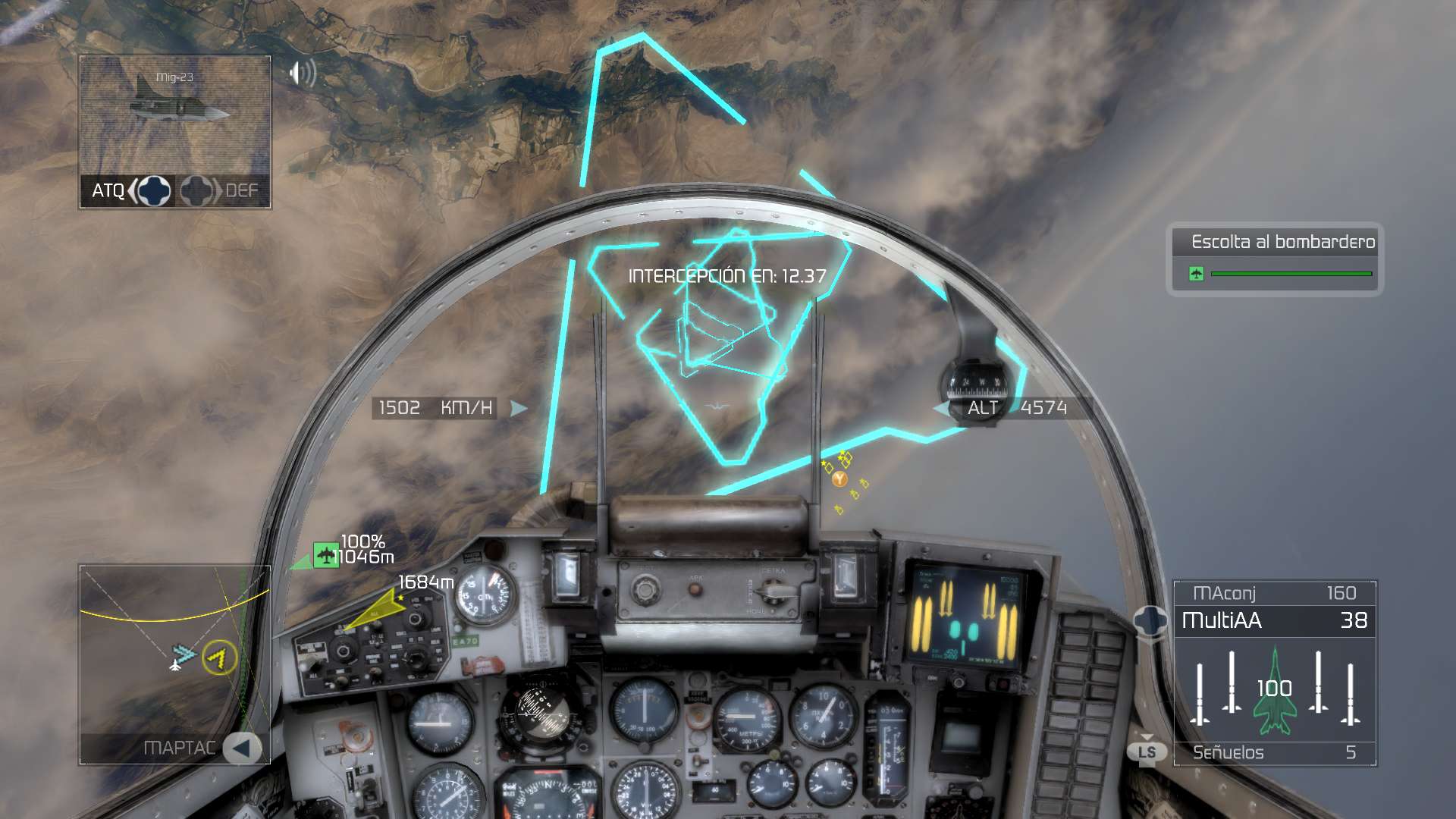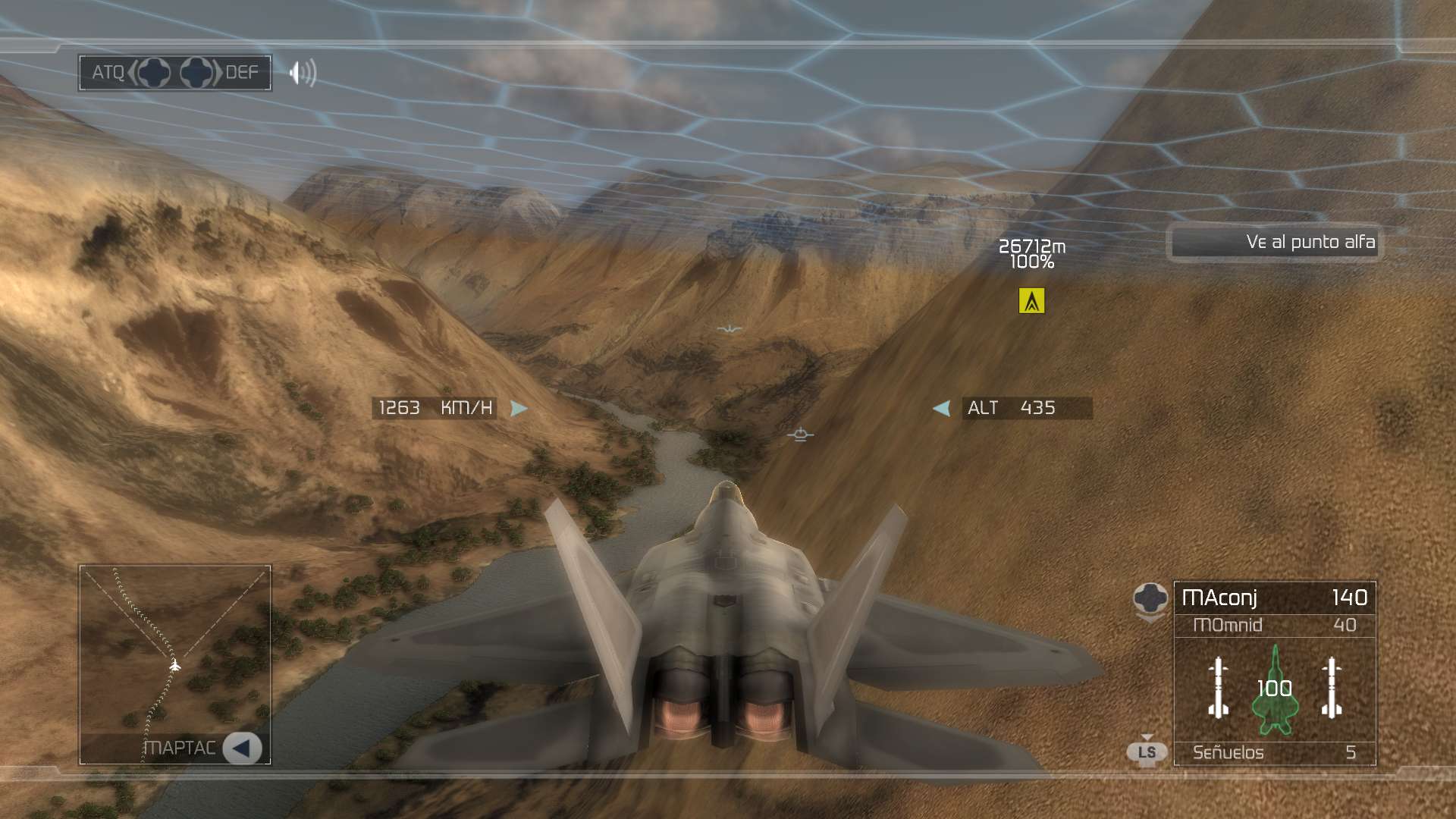 El mecanismo de vuelo está simplificado de tal manera que se puede jugar con un pad sin mayores complicaciones. No es necesario que desempolves tu flight stick para realizar las maniobras más vertiginosas, ya que bajo la apariencia de un simulador se esconde un arcade en el que prima la pericia con el gatillo sobre cualquier otra cosa. Las misiones por lo general suelen pedirnos la típica ración de enemigos aéreos, esquivar unos cuantos SAM, algún bombardeo a objetivos estratégicos… Y si bien las primeros escarceos parecen un tanto anodinos, a medida que avanzamos en la campaña todo va «in crescendo». El control es sumamente sencillo, la propia máquina fija los límites de nuestro avión para que no haya estropicios en una maniobra mal calibrada. No obstante si queremos forzar nuestro avión, existe un modo que anula las ayudas y que podemos activar en mitad del combate. Es todo muy espectacular, la cámara se posa en una vista exterior con cierta perspectiva del «dogfight», y desde ahí podemos efectuar maniobras más agresivas para esquivar un misil o enfilar a un enemigo «tocapelotas».