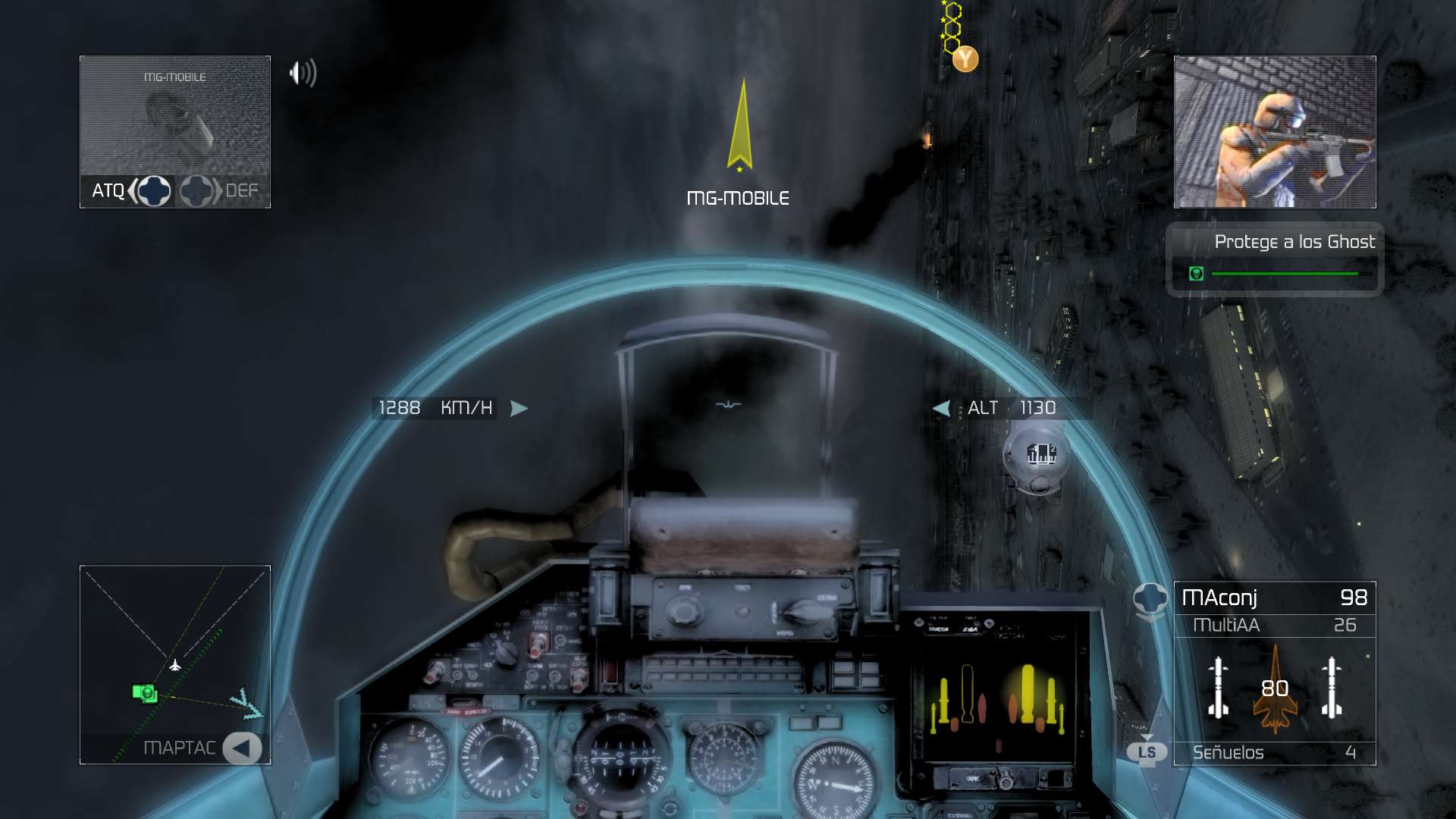 Siguiendo con el carácter arcade del juego, no están las temidas secuencias de despegue y aterrizaje, empezamos la misión directamente en el fragor de la batalla y una vez hayamos cumplido el objetivo final se supone que volvemos a casa sanos y salvos. Las misiones suelen tener una duración contenida y dividida en objetivos con su correspondiente checkpoint, así que si nos matan en un momento poco oportuno, no hace falta repetir todo el proceso desde el principio. Una vez en tierra se nos otorga una cantidad de puntos de experiencia que desbloquean nuevos aviones y armamento. Cada avión cuenta con características propias de blindaje, maniobrabilidad y velocidad, pero lo cierto es que una vez subidos a la cabina la diferencia de control entre ellos es prácticamente despreciable. La elección del avión es poco o nada determinante, y casi se puede decir lo mismo del armamento, que abunda incluso en el nivel de dificultad más elevado. Hay que ser muy «manco» para acabar con los más de 100 misiles que puede equipar cualquiera de los aviones. No hay mucho más que contar de la parte jugable, queda claro que todos los aspectos están supeditados a la facilidad de control en un intento por hacernos sentir el as del aire que tantas y tantas veces hemos visto en la gran pantalla. Que lo consiga ya es harina de otro costal, y en ello debería jugar un papel fundamental el apartado técnico.