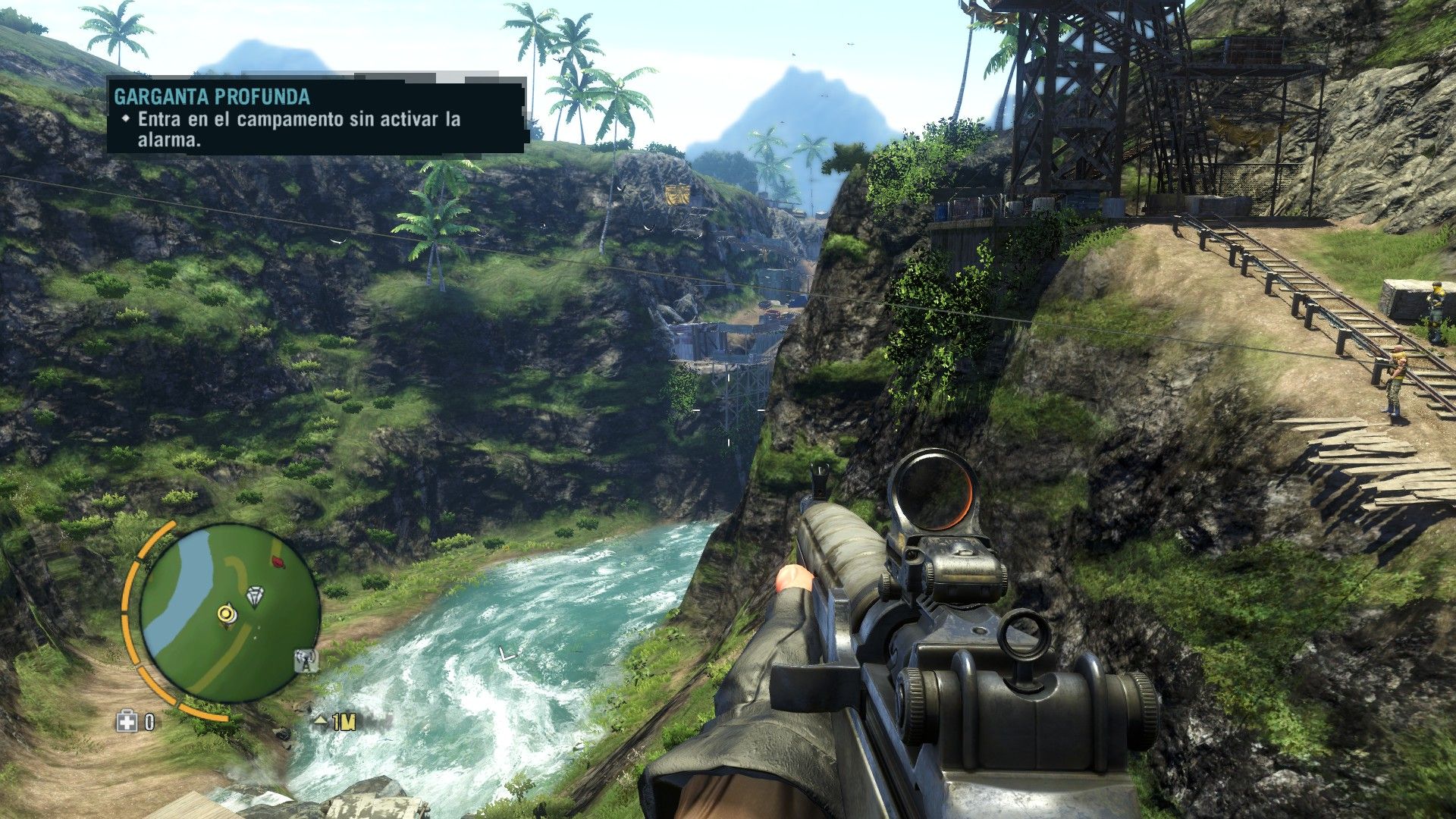 Lo que no se puede obviar de ninguna manera es el sensacional apartado gráfico. Hablando claro y en plata, estamos ante un pepino en toda regla, un auténtico deleite para nuestros ojos. La cantidad de árboles y vegetación que pone en pantalla el motor Dunia 2 es una auténtica barbaridad, y ver lo bien que se mueve en una configuración media tiene doble mérito. Ríos, lagos, cataratas, montes escarpados, acantilados… Todos los escenarios gozan de una belleza extraordinaria gracias a la combinación de fuerza bruta y de talento artístico. Además, los escenarios tienen cierto componente de destructibilidad que afecta mucho a la parte jugable, como por ejemplo coger un lanzallamas o un cóctel molotov, y quemar una zona de follaje donde están los enemigos. El efecto conseguido es realmente impresionante. Es cierto que alguna textura desentona, pero es algo totalmente perdonable y hasta cierto punto justificable, viendo la magnitud del escenario por el que nos movemos. Los personajes, en especial los rostros de los protagonistas, muestran gran detalle y expresividad, siendo la única queja la repetición de modelados para los nativos y enemigos. Me gustaría hacer especial hincapié en la recreación de la primera persona, de las mejores que he visto en mucho tiempo. La sensación de que realmente tenemos un cuerpo, unas manos, y unas piernas, está completamente conseguida, y esto queda patente no solo a la hora de manejar vehículos, sino también al curar una herida -algunas secuencias son bastante escabrosas- o al lanzarnos en picado desde un acantilado. En general se respira una sensación de empaque visual como pocos juegos son capaces de ofrecer hoy en día, y posiblemente venideros. Sonoramente no parece tan espléndido, pero a su favor cuenta con un doblaje al castellano de calidad. Curiosamente las melodías brillan por su ausencia, ya que durante casi todo el juego nos acompañan los sonidos de la isla, una decisión muy acertada, creo yo.