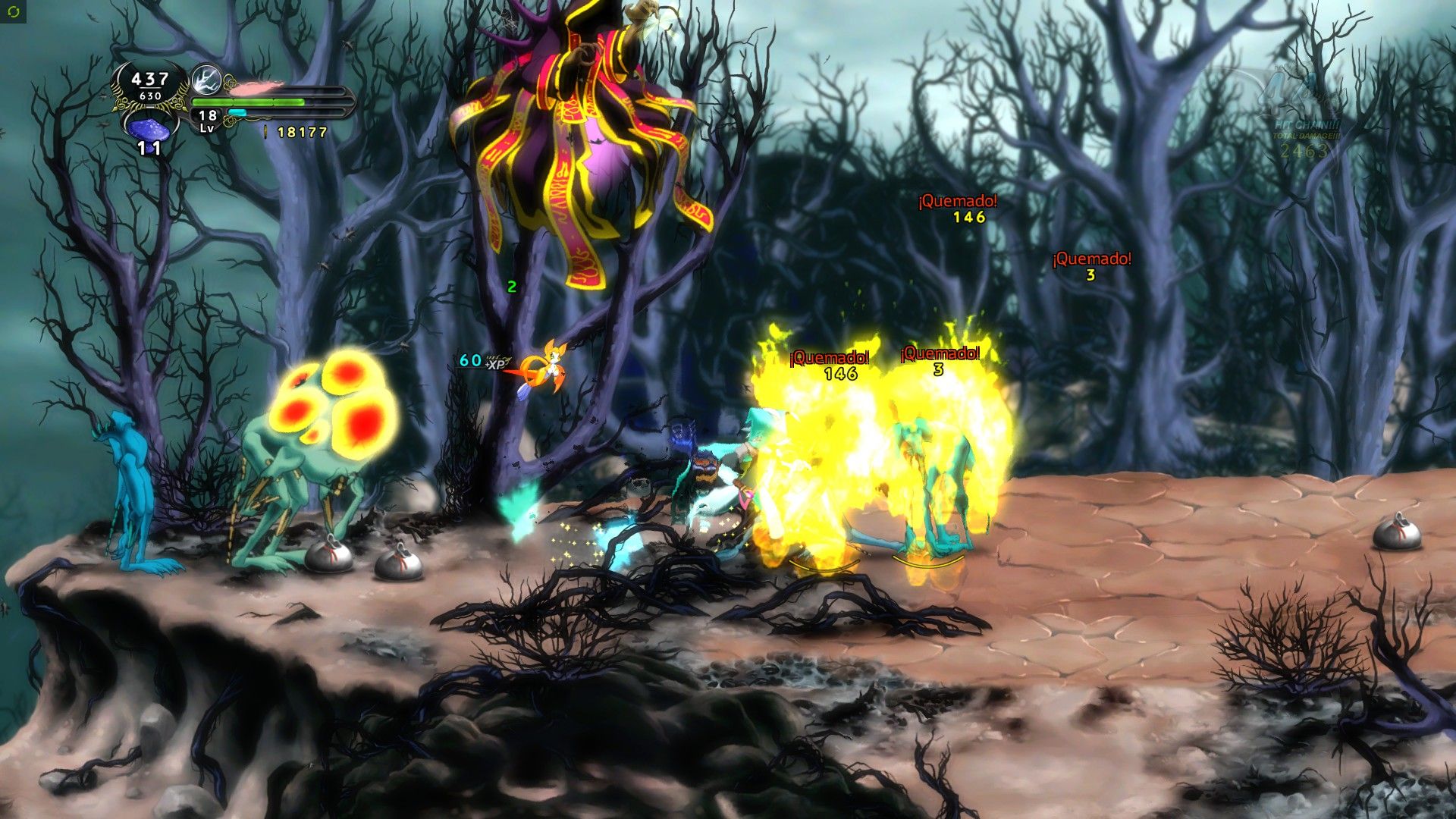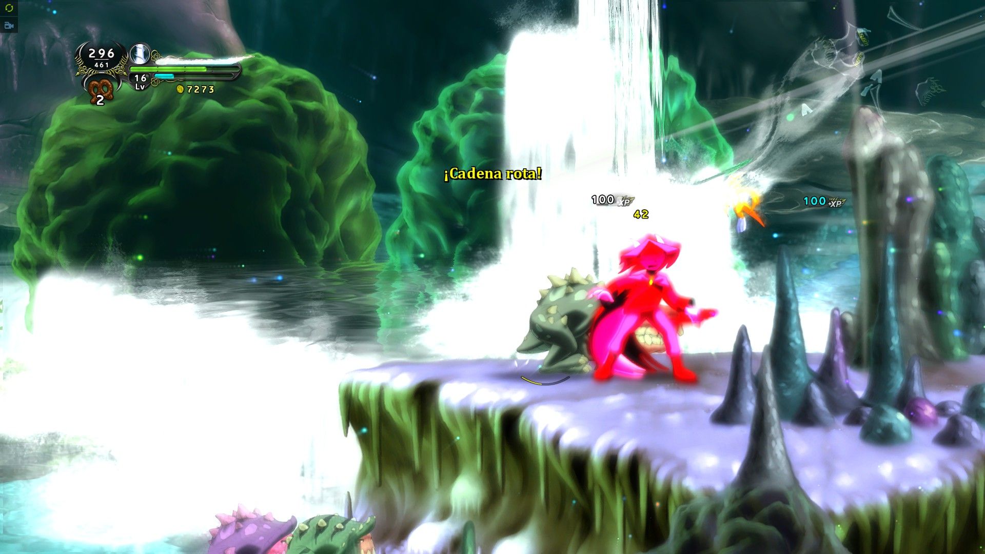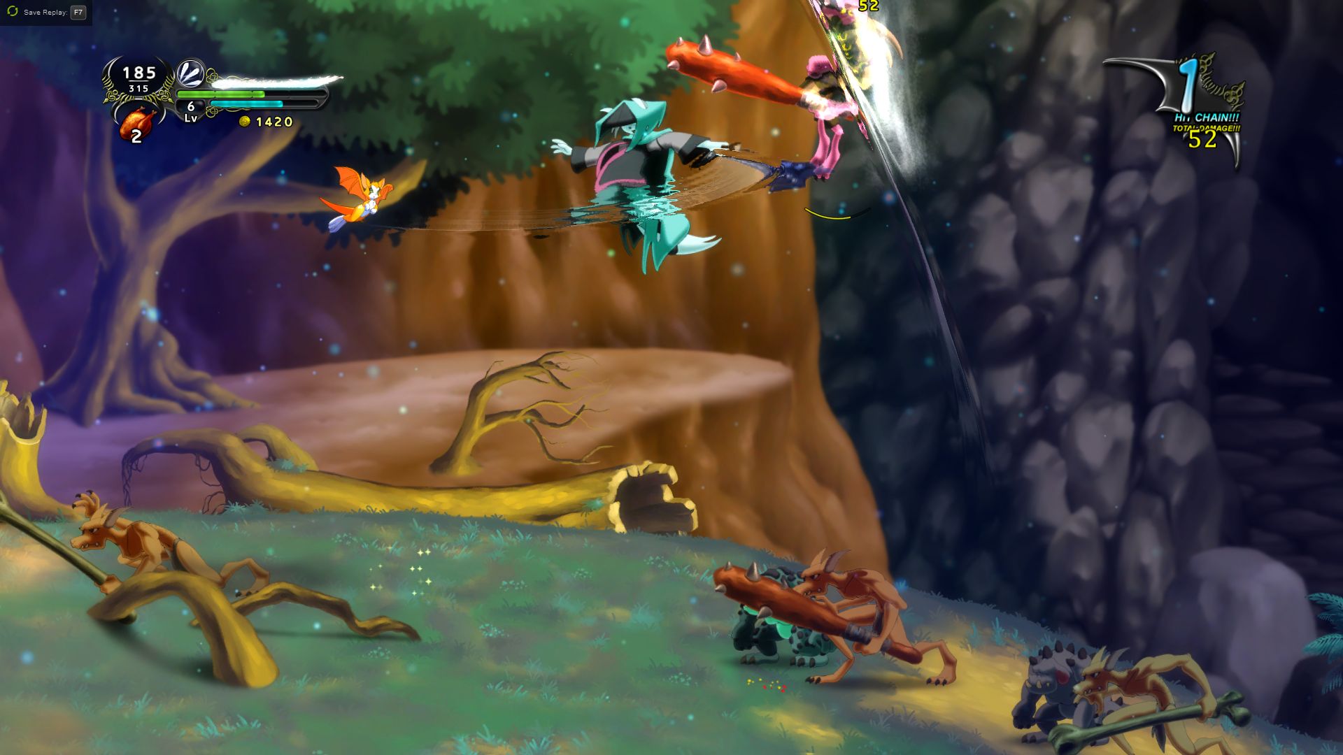 Dust también ofrece un fuerte componente de exploración. No solo se trata de ir de izquierda a derecha aporreando el botón de acción, también hay niveles de estructura laberínticica que nos obliga a estar muy atento a los posibles caminos que hay en pantalla. Muchos escenarios cuentan con rutas alternativas que nos llevan a cofres con suculentas recompensas, o por qué no, a algún objeto vital para finalizar una misión. Entre tanto desplazamiento también nos topamos con asentamientos donde conoceremos nuevos detalles de la trama, y sobre todo a personajes que nos asignarán tareas secundarias, cuya resolución nos aportará un bueno puñado de puntos de experiencia. Lo de subir niveles, a priori, no parece importante durante gran parte de la aventura, ya que el juego resulta bastante asequible incluso en el nivel de dificutad alto. Sin embargo, en el último cuarto la dificultad sufre un aumento bastante considerable, -y un poco injustificado en mi opinión- y es ahí cuando nos acordaremos de aquellos combates que rehusamos luchar por «vaguería».