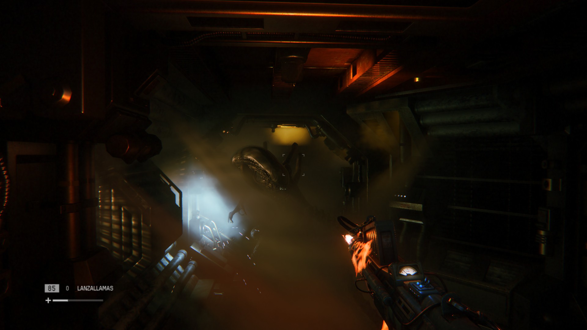 El comportamiento del Alien, aunque lejos de ser perfecto, me ha parecido bastante conseguido, y reacciona de una manera más o menos «lógica» a tus acciones. La sensación de que vive en los conductos de ventilación a la espera de que algo llame su atención, está muy bien reflejada, y solo al usar el radar de proximidad, uno de los artilugios más representativos de la saga cinematográfica, parece que el Alien esté «chetado». De hecho no se puede ir con él activado más allá de unos pocos segundos, ya que su sonido atrae al bicho a la velocidad de la luz. Tu oído será la herramienta más efectiva para saber hasta qué punto nos encontramos en peligro.