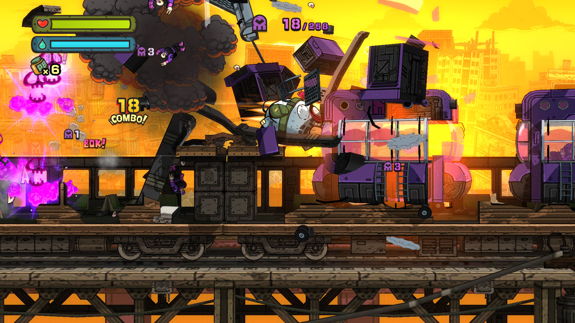 Resulta curioso que sea Sega quien distribuya un plataformas en el que prima la velocidad, y que en algunos momentos recuerda inevitablemente a los tiempos del Sonic de los 16 bits. Eso sí, una vez avanzada la aventura hay que ser algo más cautelosos, ya que la cantidad de enemigos en pantalla aumenta exponencialmente, pero siempre sin dejar de lado las dotes de velocista del protagonista. Durante los 18 niveles de los que consta el juego, «bosses» incluidos, no solo tienes que llegar al final de los mismos, sino que has de liberar a inocentes civiles, algunos ocultos en los sitios más recónditos del escenario, y ya de paso cargarte todos los enemigos posibles para desbloquear el acceso a nuevos niveles. Así que más que pasar por las fases como una estrella fugaz, toca perderse por sus secciones ocultas en busca de más enemigos que sumar tu marcador de bajas. Y es ahí cuando te percatas del buen trabajo realizado en la estructura de los niveles, que pueden parecer muy lineales al principio, pero que luego se destapan con la aparición de rutas secretas y secciones en las que la jugabilidad cambia completamente. En definitiva, y sin demasiados alardes, como plataformas puro cumple más que sobradamente.