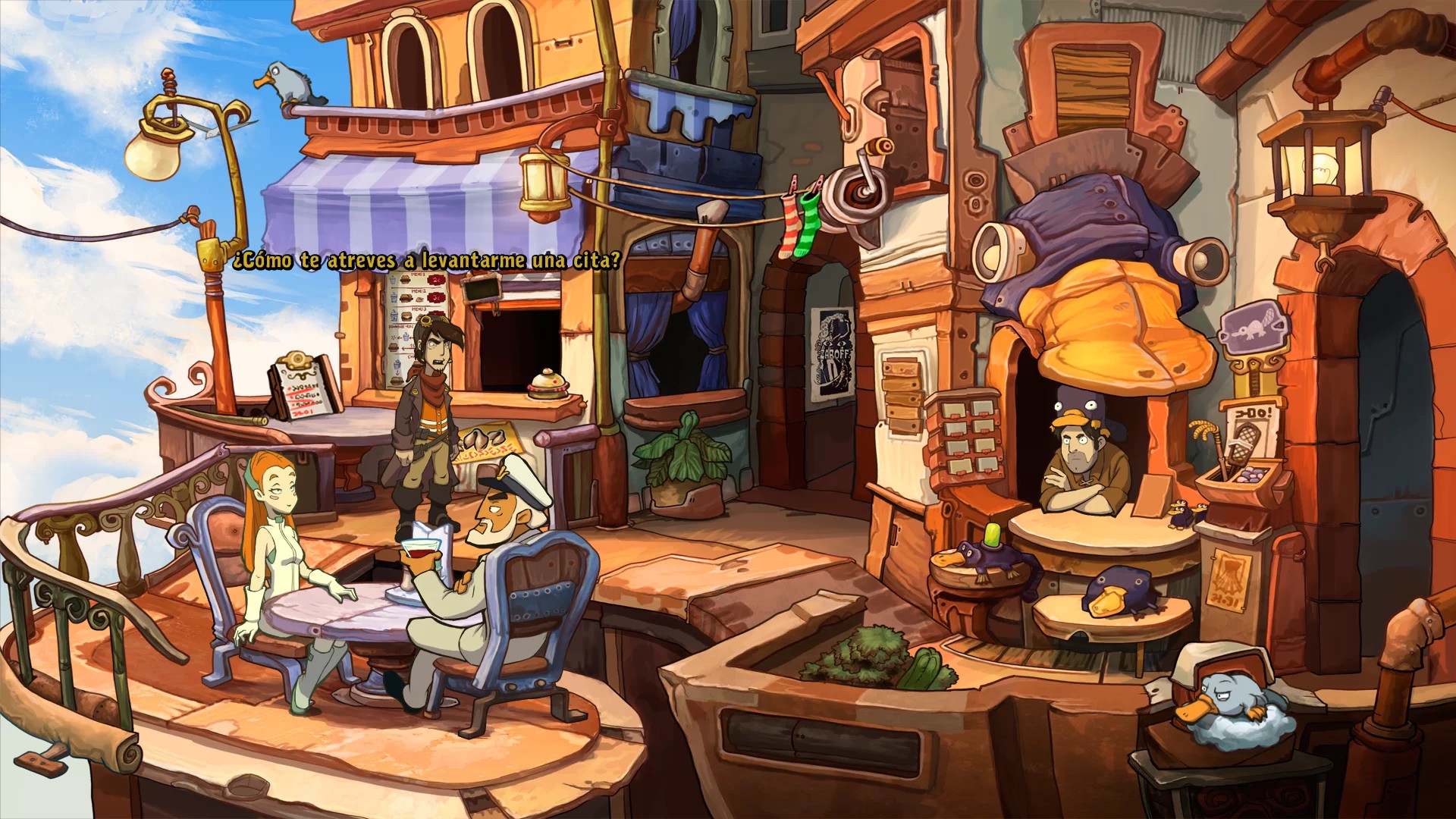 Sin embargo, al igual que pasaba en el primer Deponia, una vez pasada la primera mitad de la aventura el juego se desinfla ligeramente a nivel de diseño y complejidad. Sigue habiendo un desarrollo abierto apoyado en diferentes escenarios -aunque menos-, pero todo resulta más sencillo y menos elaborado, casi como si de un epílogo alargado se tratase en el que a poco que tengas las ideas claras, te lo puedes acabar de una tacada. Digamos que la curva de dificultad no está del todo bien ajustada, ya que empieza prácticamente en lo más alto y a medida que la historia avanza, va decayendo hasta resultar muy asequible. A pesar de ello, me parece que el conjunto ha sufrido un ligero incremento en la dificultad global, pero aún así resulta una aventura perfectamente terminable por cualquier aficionado al género.