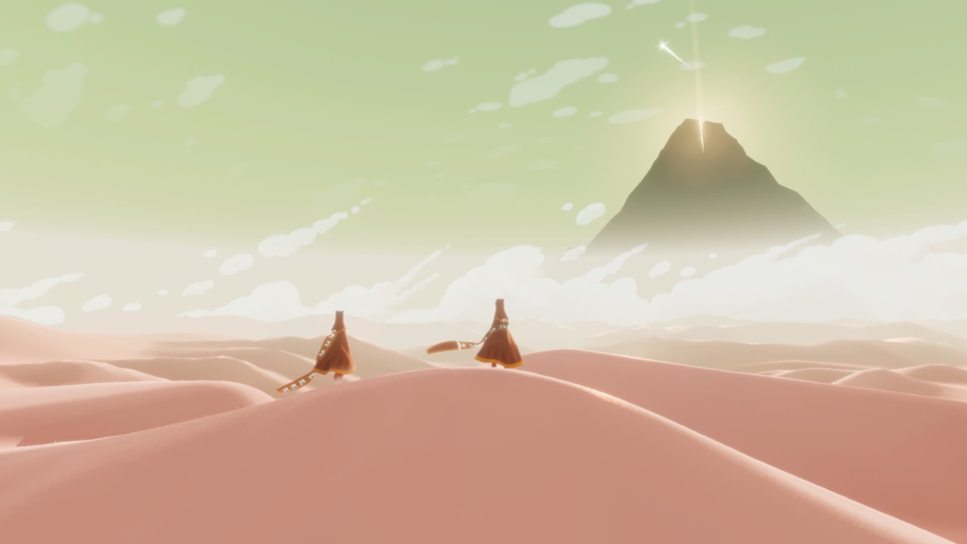Como puedes ver, Journey no va de elaboradas mecánicas jugables ni de ser especialmente habilidoso con el pad. Todo se desarrolla de manera muy orgánica, casi relajante, sin ningún tipo de indicador en pantalla que haga las veces de interfaz ni de flechas que marquen el camino hacia un supuesto checkpoint, basta con guiar a tu personaje por un mundo inhóspito, inhabitado, pero bello al mismo tiempo. Esa sensación de soledad cambia en cuanto te cruzas con alguien, otro jugador Online con el que te puedes comunicar de manera muy rudimentaria mediante sonidos y exclamaciones. Limitado, pensaréis, pero en la práctica resulta más que suficiente para llamarle la atención o hacerle saber que lo está haciendo bien. Y poco a poco ese parsimonioso viaje hacia la montaña se va convirtiendo en una experiencia audiovisual de primer nivel en la que te sientes abrumado por un envoltorio realmente especial.