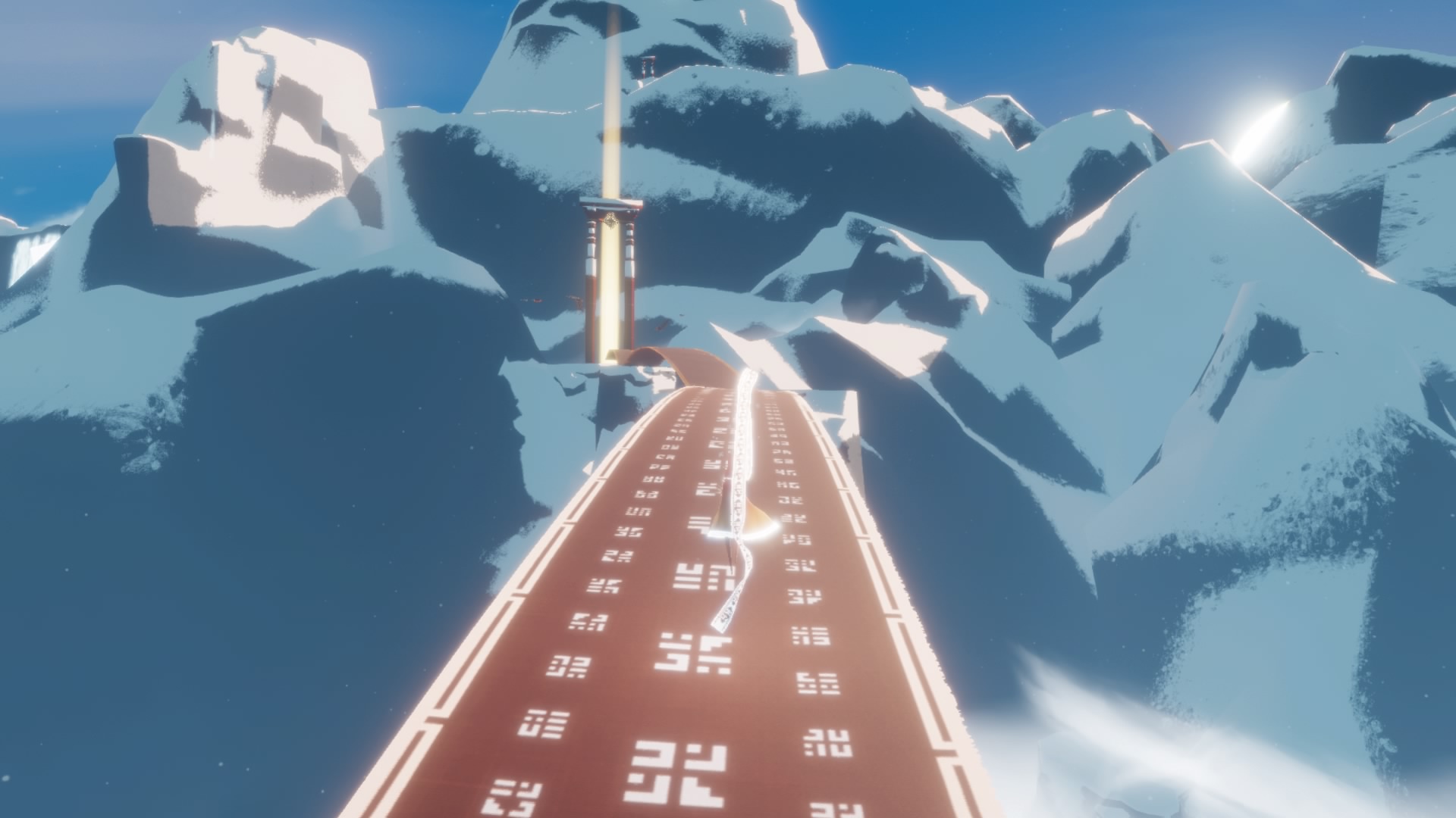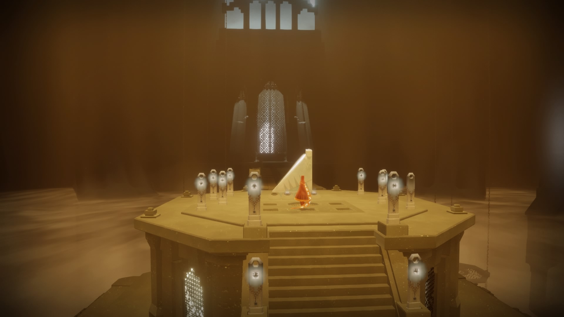 La andadura comienza por un desierto cuyas dunas cubren los restos de lo que se supone, era una antigua civilización, pero este inicio es solo la punta de un pequeño iceberg de lo que te espera más adelante. Pronto te das cuenta que tu personaje puede recoger una especie de orbes que le permiten saltar y volar durante unos breves instantes. Cuantos más cojas, si es que te da por ello, podrás mantenerte en el aire durante más tiempo; y si no, tampoco hay que agobiarse ya que el juego está concebido para que puedas llegar al fin del viaje sin necesidad de «mejorar» nada. No hay botón de correr, simplemente te limitas a trotar y cuando la situación lo requiere te deslizas sobre la arena como si de un surfista se tratase, o te tambaleas contra los efectos de un viento desgarrador. De vez en cuando el acceso a ciertas estructuras plantean pequeños puzles de muy fácil resolución, y no solo eso, también puedes reactivar algunos monolitos que desvelan una especie de jeroglíficos sobre el camino que te espera a continuación. No es una información relevante que tengas que memorizar de cara al viaje, pero sirven a modo de ambientación, más que nada.