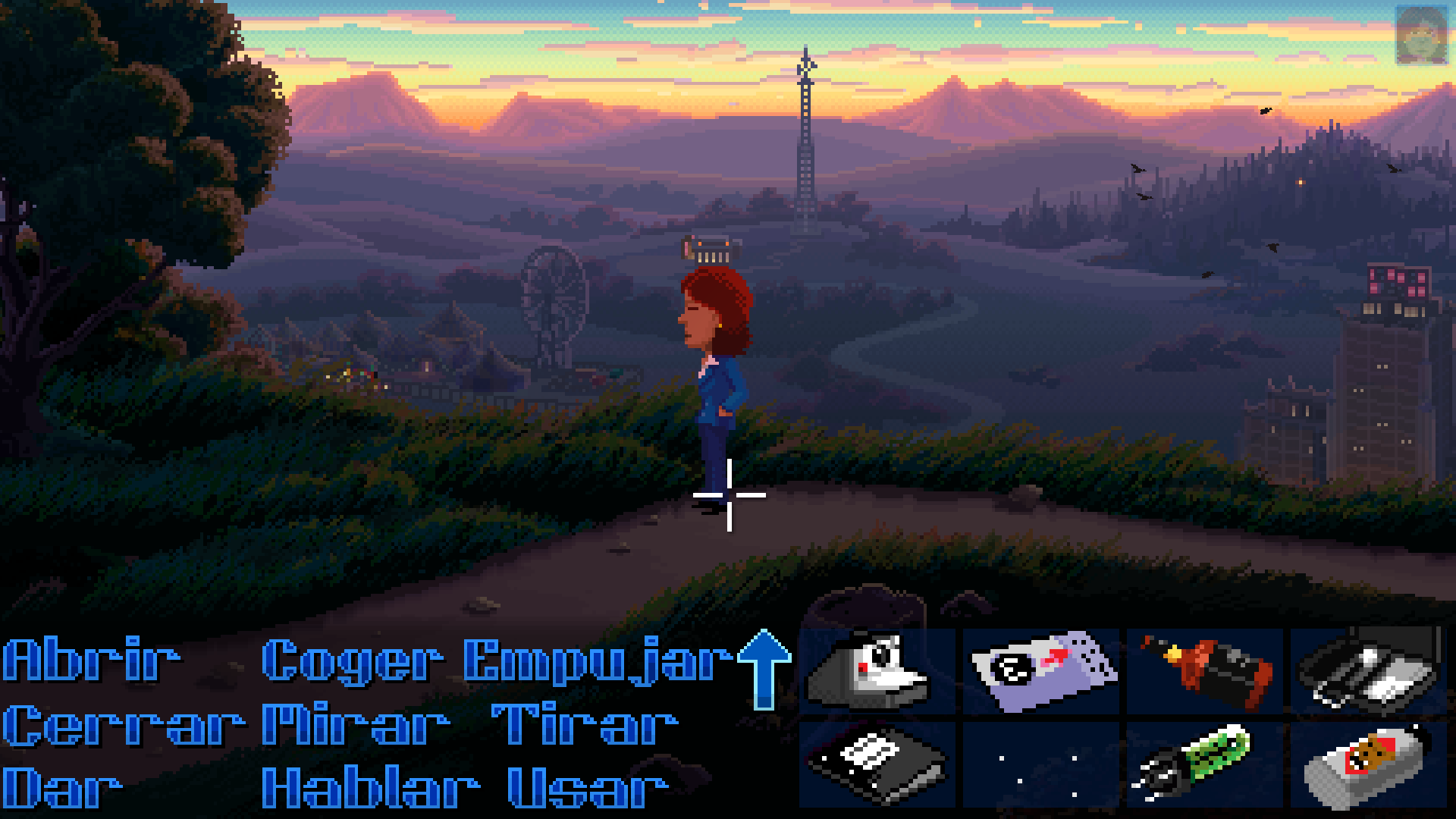 Además, estamos ante una aventura larga con un montón de escenarios que explorar. Me ha sorprendido gratamente la variedad de entornos que hay, y cómo a mitad del juego se abre el típico mapa cenital desde el que desplazarse por las distintas estancias de una manera rápida y sencilla. Y créeme que vas a hacer uso de él de manera asidua. Que si prueba el objeto de un personaje por aquí, que si llévale un objeto al otro personaje que está en la otra punta del pueblo… Puede sonar un poco rollo, pero en la práctica no lo es en absoluto. Hay tantos frentes abiertos en todo momento, que nuestra mente no para de imaginar los usos más variopintos a los objetos del inventario. Prácticamente todos los puzles obedecen a una lógica aplastante, demostrando que se puede conseguir una aventura compleja sin necesidad de tirar de «mala leche» ni de usos absurdos de objetos. Thimbleweed Park no solo se limita a copiar, también hace por mejorar los aspectos más criticados de los clásicos.