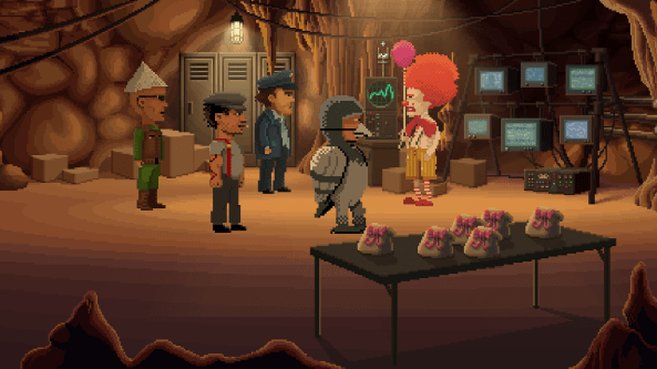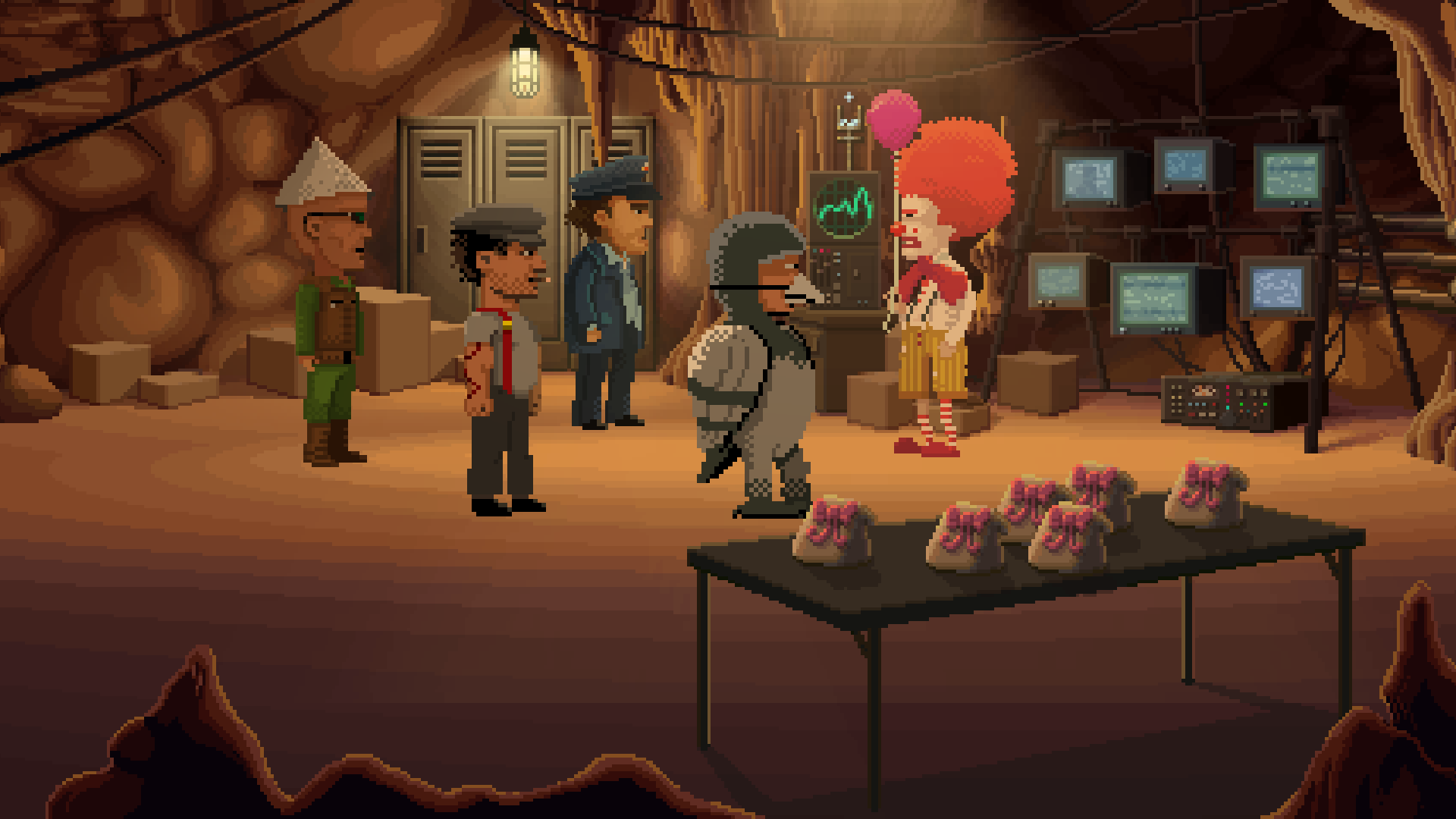 El argumento del juego nos traslada a Thimbleweed Park, una pequeña localidad de apenas ochenta habitantes, en la que se acaba de producir un misterioso asesinato que, como puedes imaginar, deberás resolver. La aventura te pone a los mandos de nada menos que cinco personajes, cada uno de ellos con su propio trasfondo, motivaciones e inventario que has de combinar. Dos policías, una joven programadora, un payaso e incluso un fantasma, son los protagonistas de una historia surrealista, larga y con abundantes toques de humor marca de la factoría Lucas. Las referencias a los clásicos de la mítica compañía están a la orden del día, ya sea en forma de diálogos, o puzles. De hecho el juego no hace nada por disimularlas, sino todo lo contrario, más bien las potencia para sacarte una sonrisilla en plan «leche, esto ya lo he visto antes». Si el juego nació como un homenaje, ¿por qué ocultarlo?