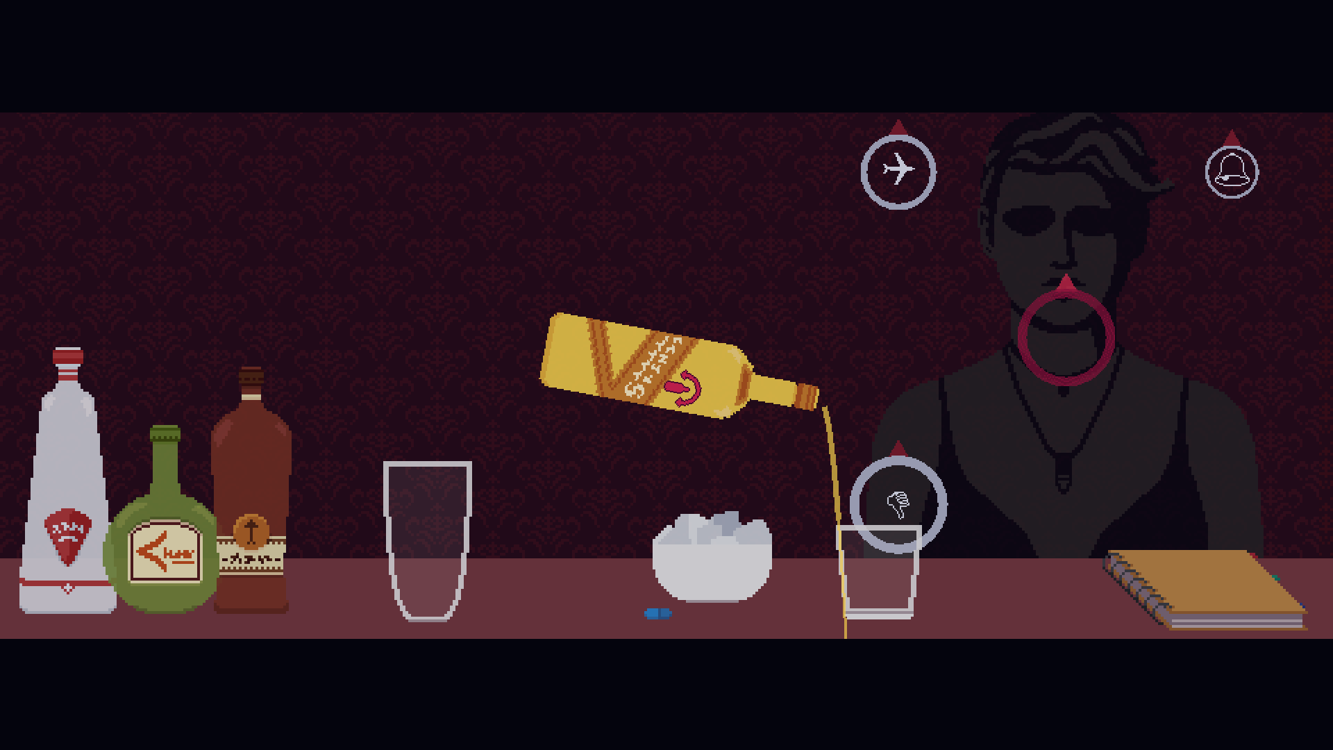 La primera impresión que produce The Red Strings Club es que estamos ante una aventura gráfica con gráficos pixel art incluidos, otra de las muchas que hay por el mercado independiente. Pero esa apariencia no es más que una fachada que da cabida a un título puramente narrativo en el que la historia se desarrolla a través de decenas de líneas de diálogo y decisiones, las cuales solo se ven interrumpidas por un par de mecánicas jugables la mar de originales. Una de ellas consiste en saber preparar un buen cóctel capaz de destapar la lengua del cliente. La práctica en sí es muy sencilla, basta con ir echando licores hasta hacer coincidir un círculo con los estados de ánimo del cliente. La elaboración del cóctel tiene la capacidad de iniciar la conversación desde diversos estados de ánimo. ¿Quieres sonsacarle información desde la nostalgia, desde la euforia, desde la duda, o desde la depresión? Suena bastante original, ¿verdad? Lo cierto es que dicha mecánica, más allá de su originalidad, se usa en menos ocasiones de las esperadas a lo largo del juego, y en cierto sentido se siente hasta desaprovechada cuando al poco de empezar la historia se van desbloqueando nuevas posibilidades a la hora de preparar los cócteles, dando la sensación de que la cosa terminará adquiriendo una complejidad que nunca llega.