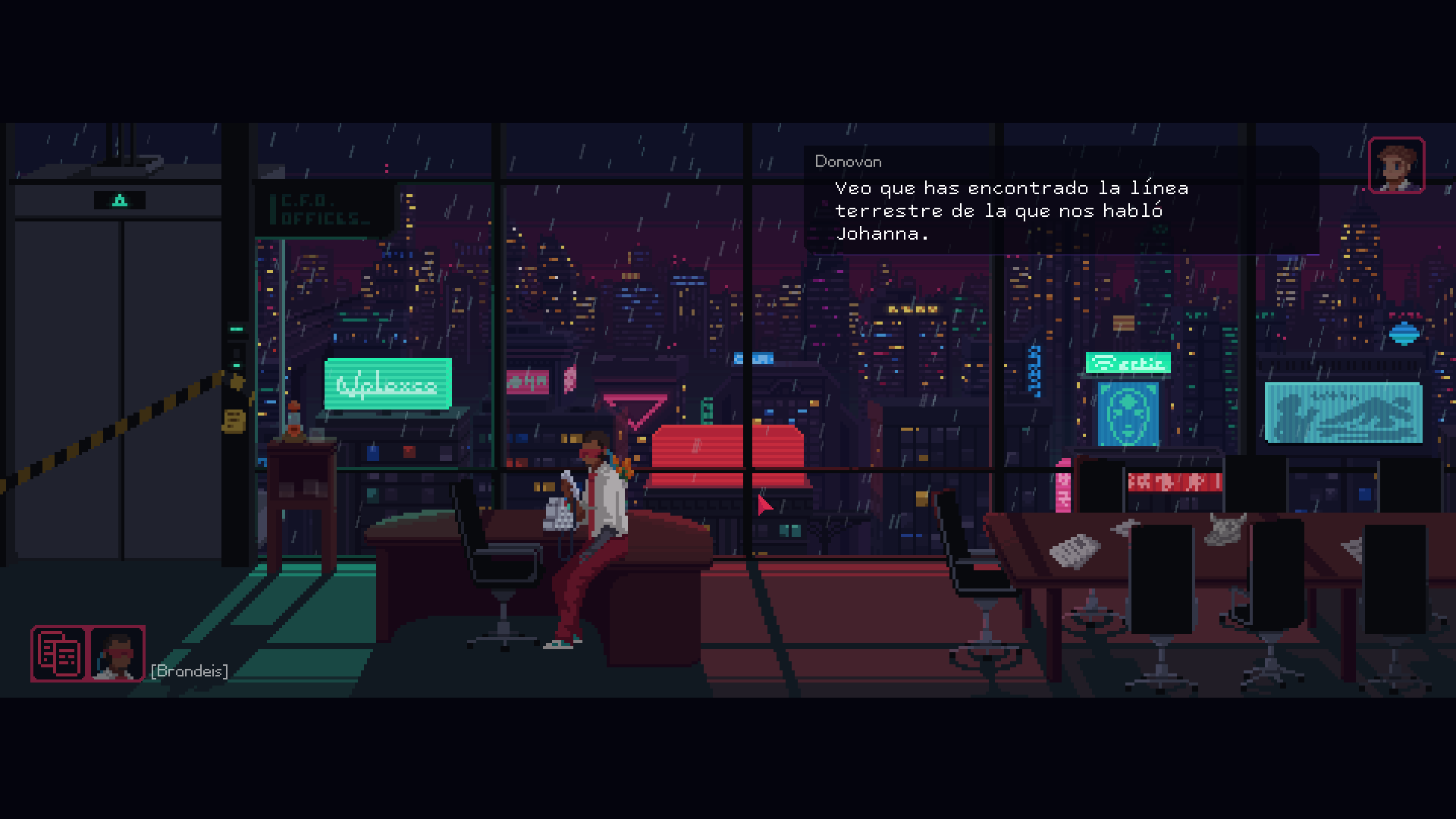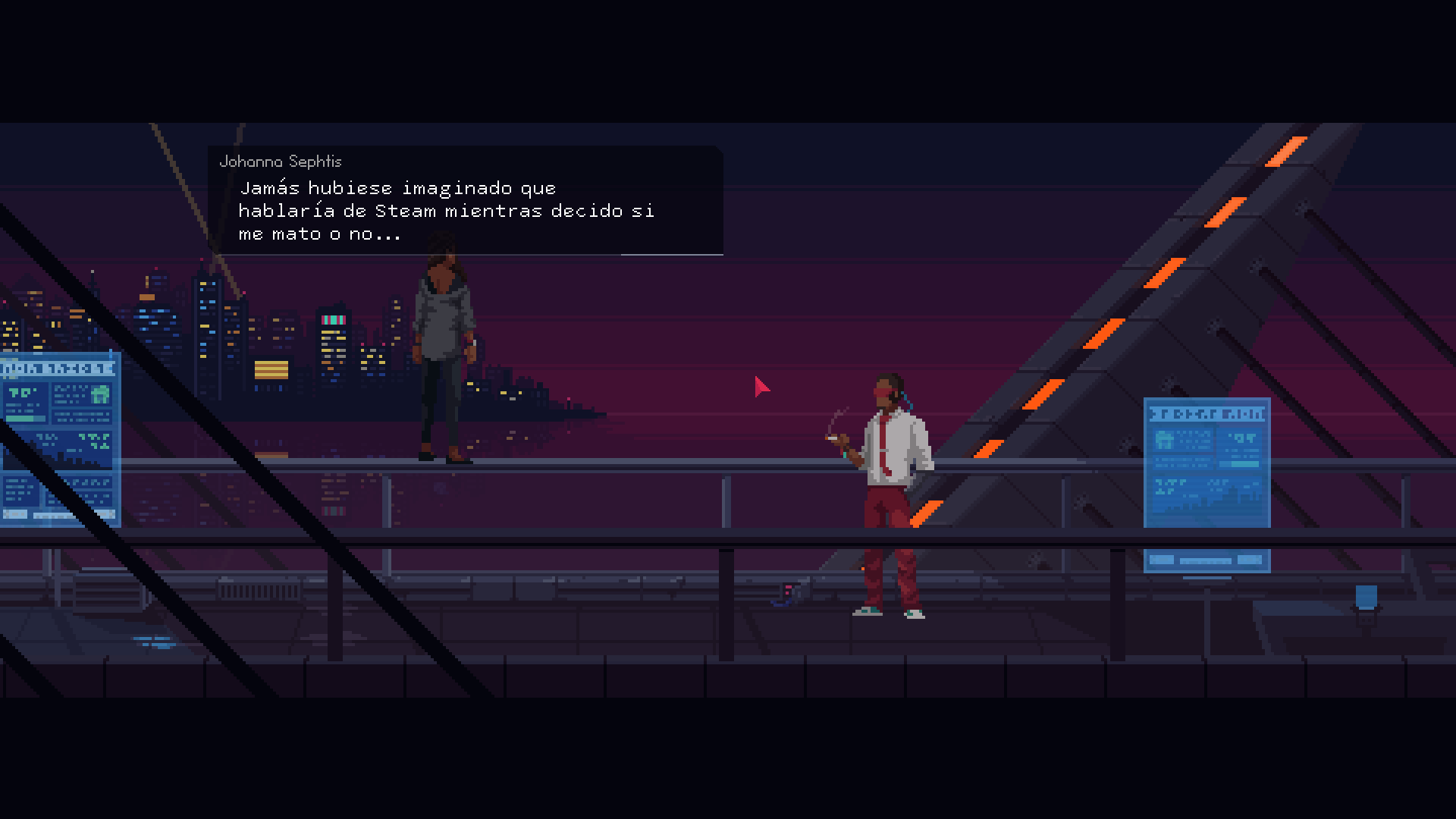 Es impresionante ver cómo se ha conseguido tal grado de inmersión en la historia, cuando todo el envoltorio gráfico no va más allá de unas pocas pantallas y personajes pixelados con cierto encanto, pero lejos de los mejores exponentes de este estilo retro. De hecho vas a pasar gran parte del juego viendo el mismo escenario de fondo, el interior del Red Strings, y solo en ocasiones puntuales tendrás el «privilegio» de pasar a otra estancia. Esa parquedad gráfica no tiene que sentirse como algo negativo, de hecho dado el carácter narrativo que emana por cada uno de sus bits, tampoco necesita de muchas más florituras. Además, el estupendo apartado sonoro plagado de melodías de carácter futurista, se ocupa de rellenar cualquier carencia ambiental que pudieras sentir.
