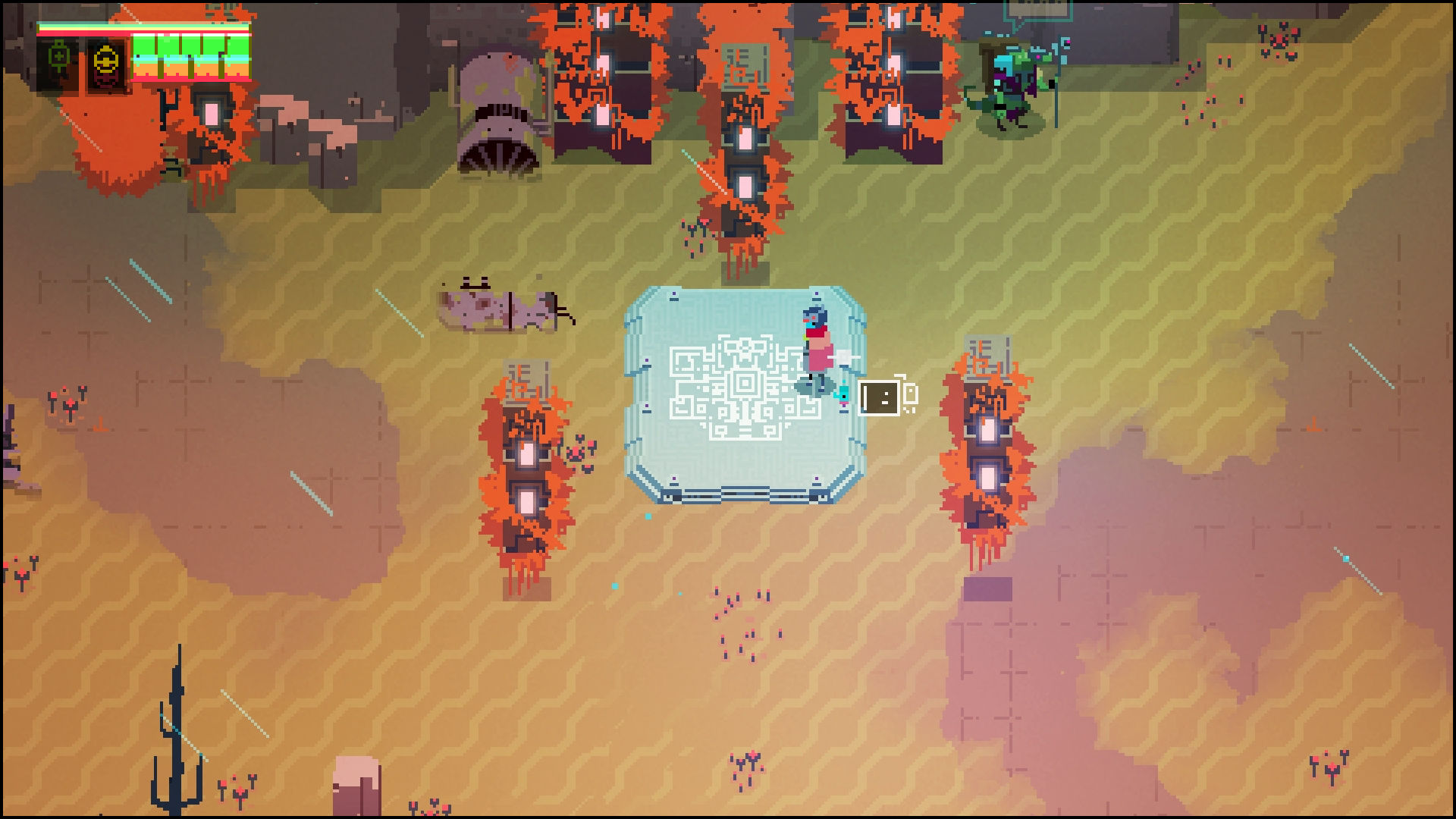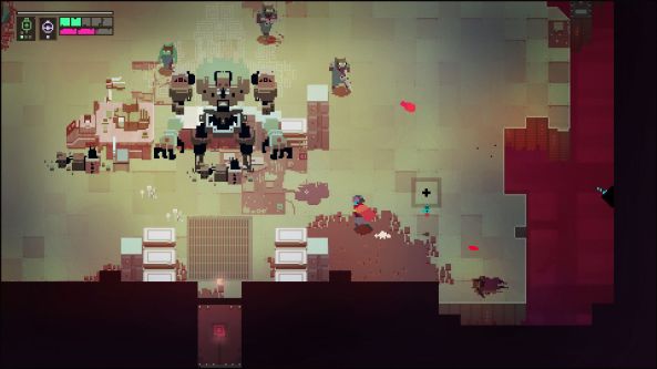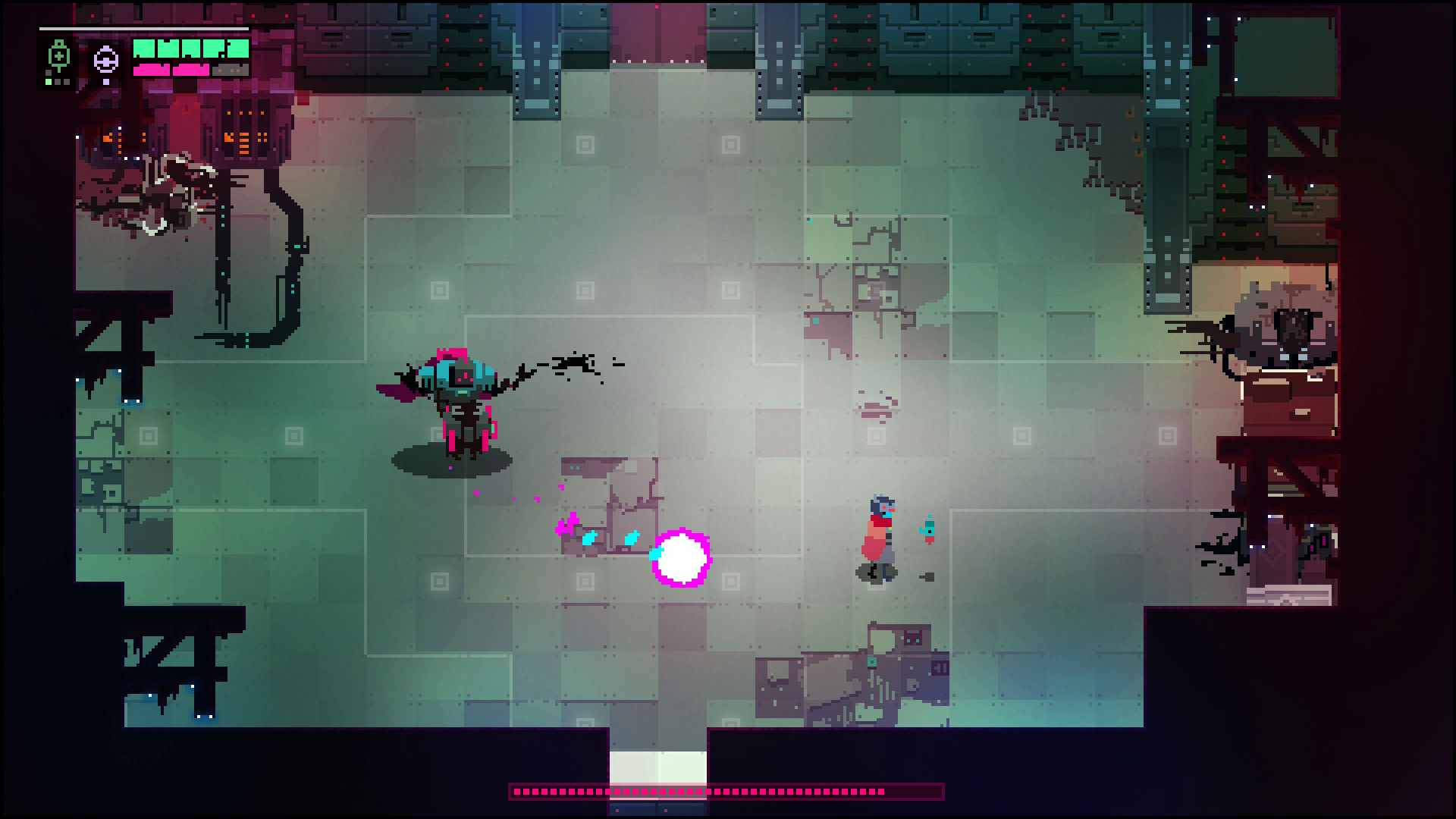 También tiene su encanto un nivel de dificultad realmente bien estudiado. Hyperlight Drifter es de esos juegos en los que puedes morir en cualquier momento, y da igual lo equipado que vayas, o los botiquines que tengas en tu haber. Si encuentras un grupo heterogéneo de enemigos y fallas un par de veces en el timming de los golpes y esquivas, estás muerto. Mención especial para los jefes finales, que no son muchos pero sí desafiantes y muy bien realizados. Estos pueden parecer muy complicados, y de hecho están pensados para que muerdas el polvo decenas de veces en cada enfrentamiento, pero el juego se las apaña para que no sientas frustración en ningún momento, siendo este aspecto uno de los grandes triunfos del producto. No es casualidad que una vez acabada la aventura se habilite un nuevo modo de juego que consiste precisamente en un «boss rush» en el que poner a prueba tu destreza a los mandos.