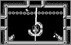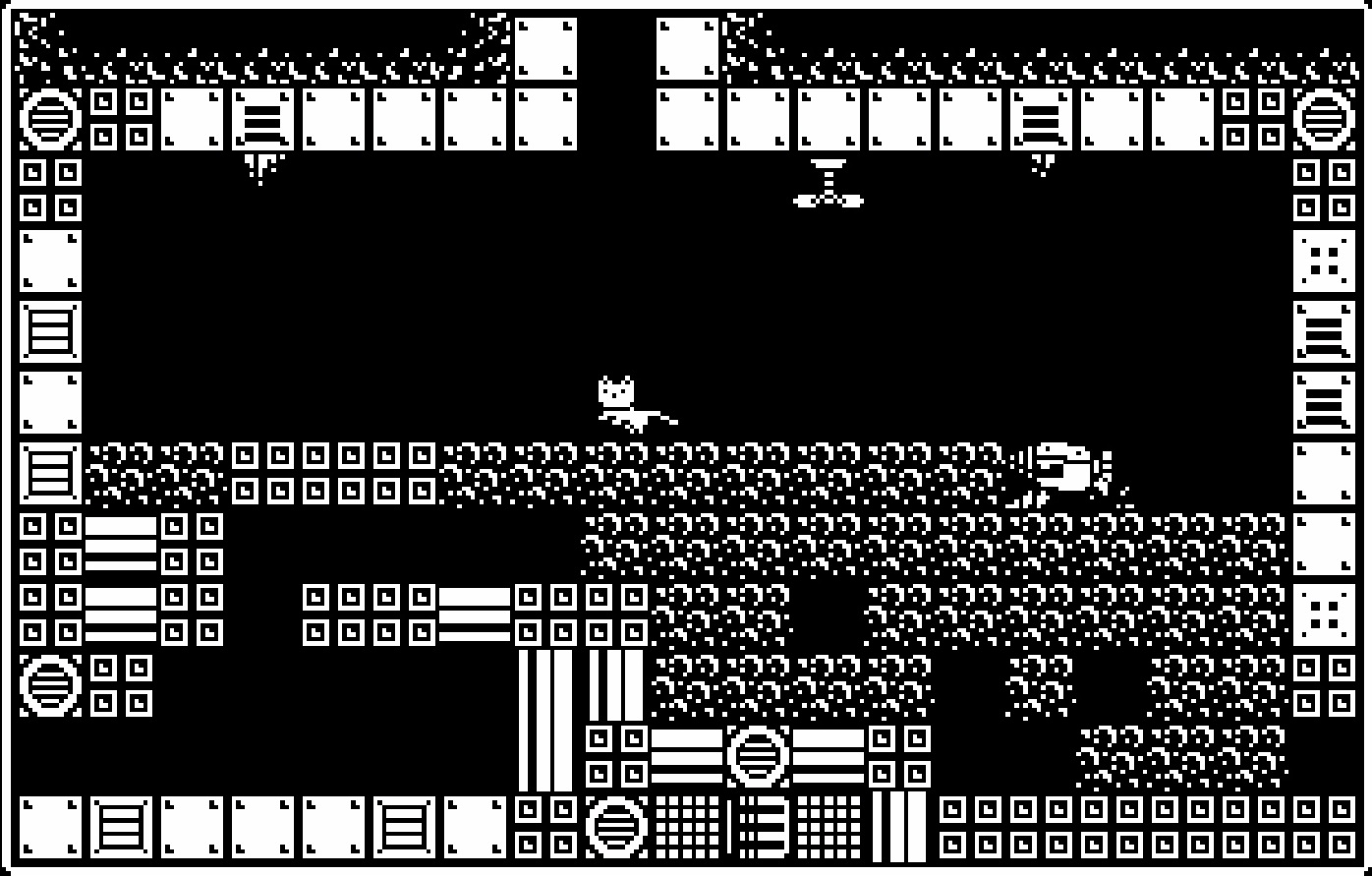 Con un título como Gato Roboto, te puedes imaginar que a nivel de argumental no hay mucho que destacar. Una nave que acaba de estrellarse en un planeta, un laboratorio de investigación en el que están ocurriendo cosas raras, y una gatita como protagonista que debe encontrar la forma de escapar. Más allá de este curioso argumento, lo primero que llama la atención es el apartado estético. Sus propios desarrolladores reconocen la inspiración en los juegos de la primera Nintendo, pero dado el carácter monocromo de sus gráficos, yo me inclinaría más hacia los juegos de Spectrum, aunque lógicamente con una suavidad de movimientos que aquellas máquinas no podrían conseguir de ninguna manera. Se nota que hay muchos frames de animación, y lo mejor es que la acción fluye a una velocidad endiablada gracias a un control del personaje exquisito. Esto, unido a una banda sonora machacona que recuerda a los geniales «mods» de Amiga, y a unos efectos sonoros robotizados adrede, terminan ofreciendo un paquete audiovisual tan personal como atractivo.