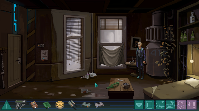 La puesta en práctica de este prometedor argumento es similar a la de cualquier aventura gráfica de corte clásico. El juego ofrece un acabado gráfico 2D muy inspirado en las producciones de la primera mitad de la década de los noventa, aunque con un estilo algo más apagado. Quizá este aspecto se haya buscado adrede para ser un fiel reflejo de la historia, pero desde luego no resulta un juego especialmente bonito. Los personajes tampoco cuentan con mucho detalle, algo que podría ser comprensible por tratarse de un juego en cierta medida pixel art, pero tampoco hay muchos frames de animación que enfaticen sus movimientos, ni expresiones faciales en los primeros planos. En resumidas cuentas, el conjunto visual me ha parecido soso. Y algo similar ocurre con el acompañamiento musical, del cual no recuerdo ninguna melodía inspirada, pero termina cumpliendo su función de ambientar durante la aventura. Aunque todo esto tampoco dice mucho de lo realmente importante en un aventura gráfica, así que, vayamos a ello.