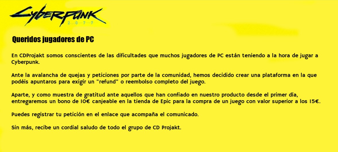 Ante el accidentado lanzamiento que ha tenido el juego Cyberpunk 2077, CDProjekt ha emitido un comunicado en el que se anuncia la creación de una plataforma de afectados en la que puedes suscribirte para reclamar la devolución íntegra del coste del juego, así como 10€ para canjear en la Epic Store. A continuación podéis leer el comunicado: